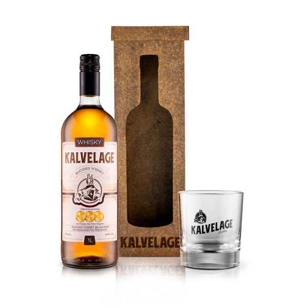 Kit Blended Whisky Kalvelage com Caixa de Presente de Madeira e Copo Baixo — Um presente único e memorável para momentos especiais.